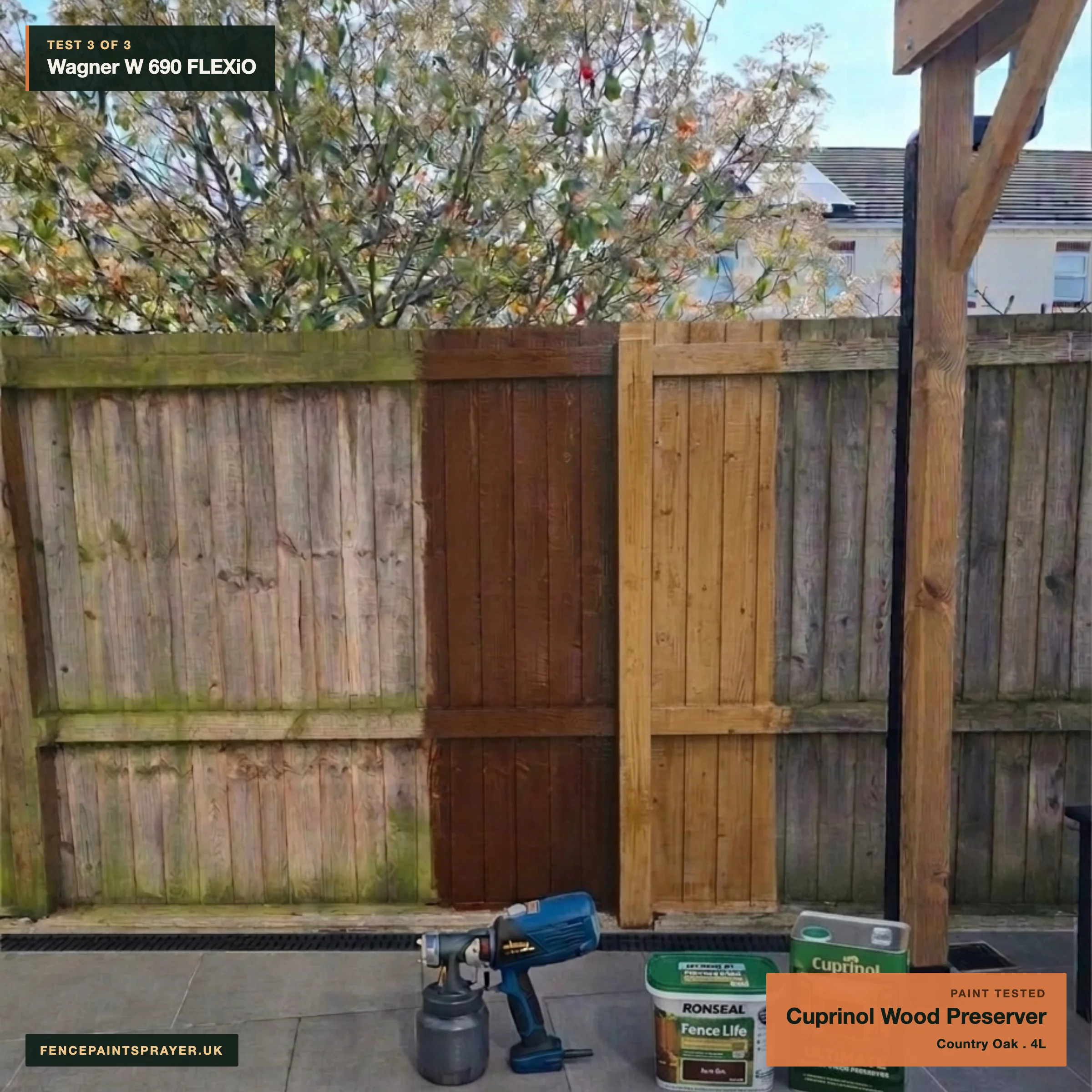The W 690 FLEXiO sprayed three fence paints (Cuprinol Ducksback Forest Oak, Ronseal One Coat Fence Life Dark Oak, and Cuprinol Ultimate Garden Wood Preserver Country Oak) onto the same 1.8 metre close board panel across three weekend sessions between 16 and 30 August 2025. Every session sat inside the UK spring fence painting window: outdoor temperatures between 11 °C and 14 °C, wind under 5 mph, and no rain in the 24 hours before or after each pass.